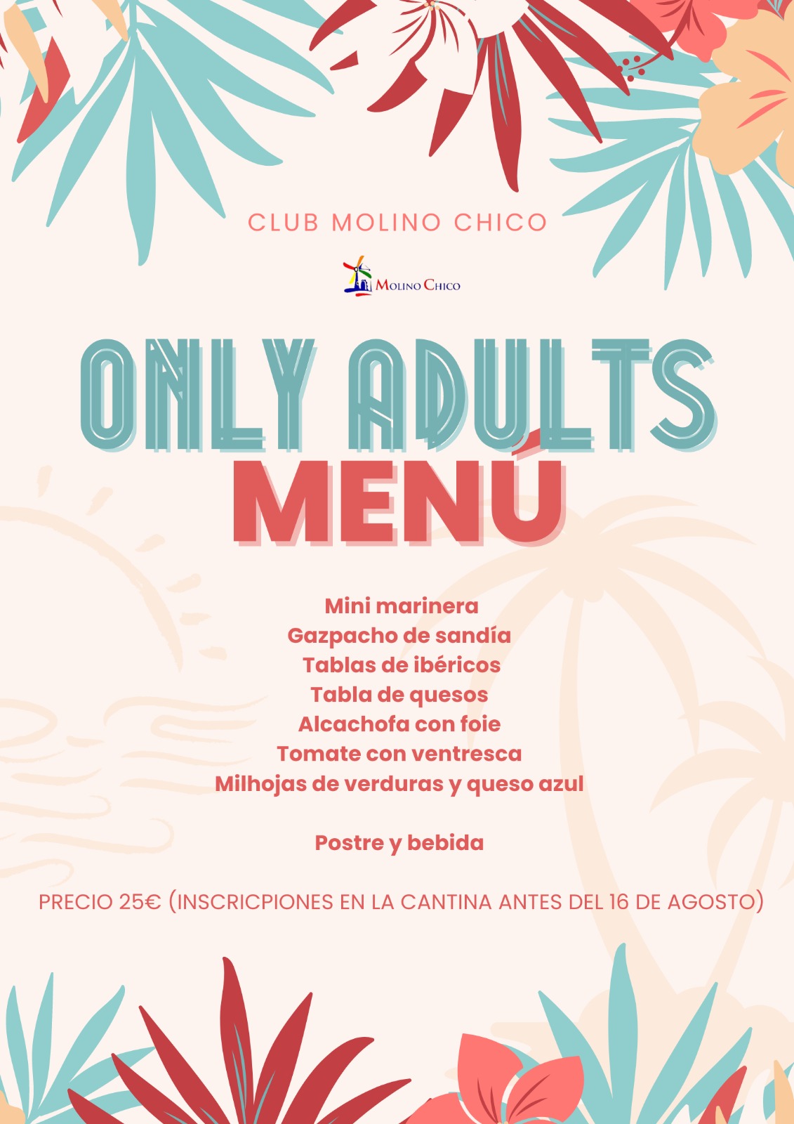 ONLY ADULTS (solo para socios) es la fiesta del verano, una cena cocktail en la cantina y fiesta y copas alrededor de la piscina sólo para adultos porque los padres también nos merecemos una noche para disfrutar, para pasarlo bien sin tener que estar pendientes de los más pequeños.